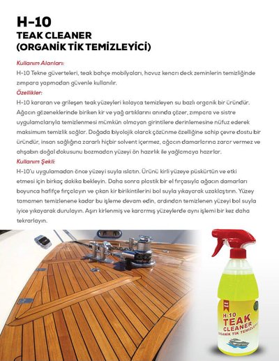 H-10 kararan ve grileşen teak yüzeyleri kolayca temizleyen su bazlı organik bir üründür. Ağacın gözeneklerinde biriken kir ve yağ artıklarını anında çözer, zımpara ve sistre uygulamalarıyla temizlenmesi mümkün olmayan girintilere derinlemesine nüfuz ederek maksimum temizlik sağlar. Doğada biyolojik olarak çözünme özelliğine sahip çevre dostu bir üründür, insan sağlığına zararlı hiçbir solvent içermez, ağacın damarlarına zarar vermez ve ahşabın doğal dokusunu bozmadan yüzeyi ön hazırlık ile yağlamaya hazırlar.