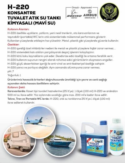 H-220 özellikle uçakların, yatların, yeni nesil trenlerin, oto karavanlarının ve taşınabilir (portable) WC lerin atık sistemlerinde mükemmel performans gösterir. Kullanılan yüzeylerde etkileşim hızı yüksektir. Metal, plastik gibi yüzeylerde güvenle kullanılır.