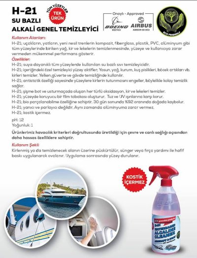 H-21; uçakların, yatların, yeni nesil trenlerin kompozit, fiberglass, plastik, PVC, alüminyum gibi tüm yüzeylerinde biriken yağ, kir ve lekelerin temizlenmesinde, yüzeye ve kullanıcıya zarar vermeden mükemmel performans gösterir.