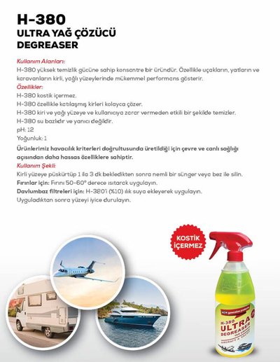H-380 yüksek temizlik gücüne sahip konsantre bir üründür. Özellikle uçakların, yatların ve karavanların kirli, yağlı yüzeylerinde mükemmel performans gösterir.