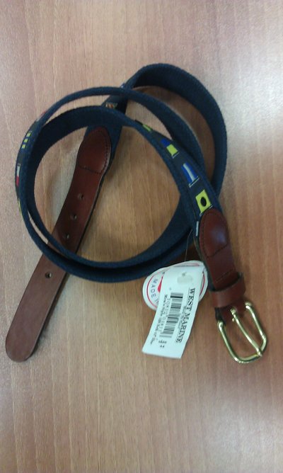 38 mm genişliğinde, tokası D halka şeklinde, istenilen ölçüde ayarlanabilir pamuklu örme kemer. Navy zemin üzerinde mavi kod bayraklı desenleri vardır. Normal bedeninize göre ölçülerde 36 dan 44 numaraya kadar olanlar mevcuttur.